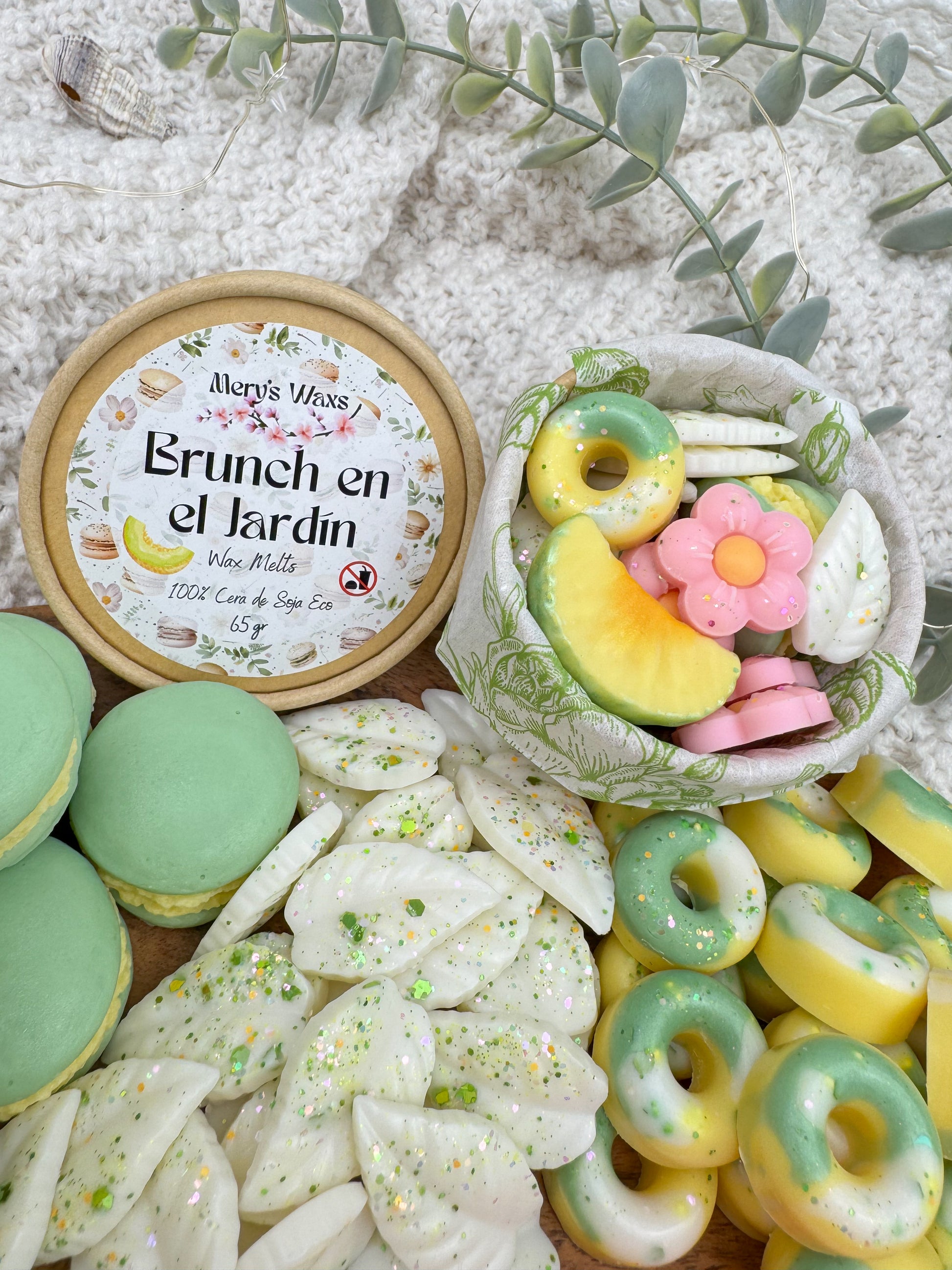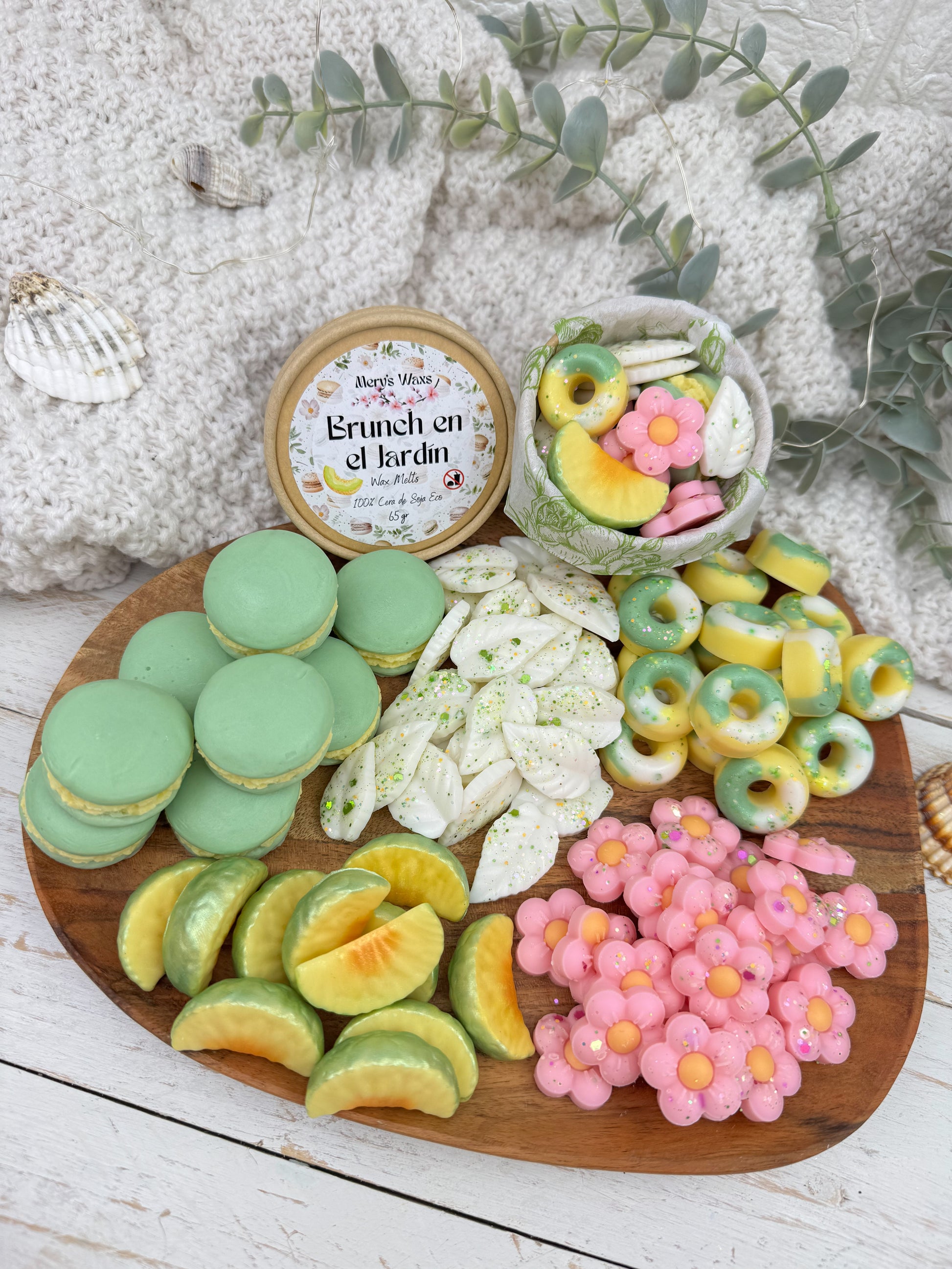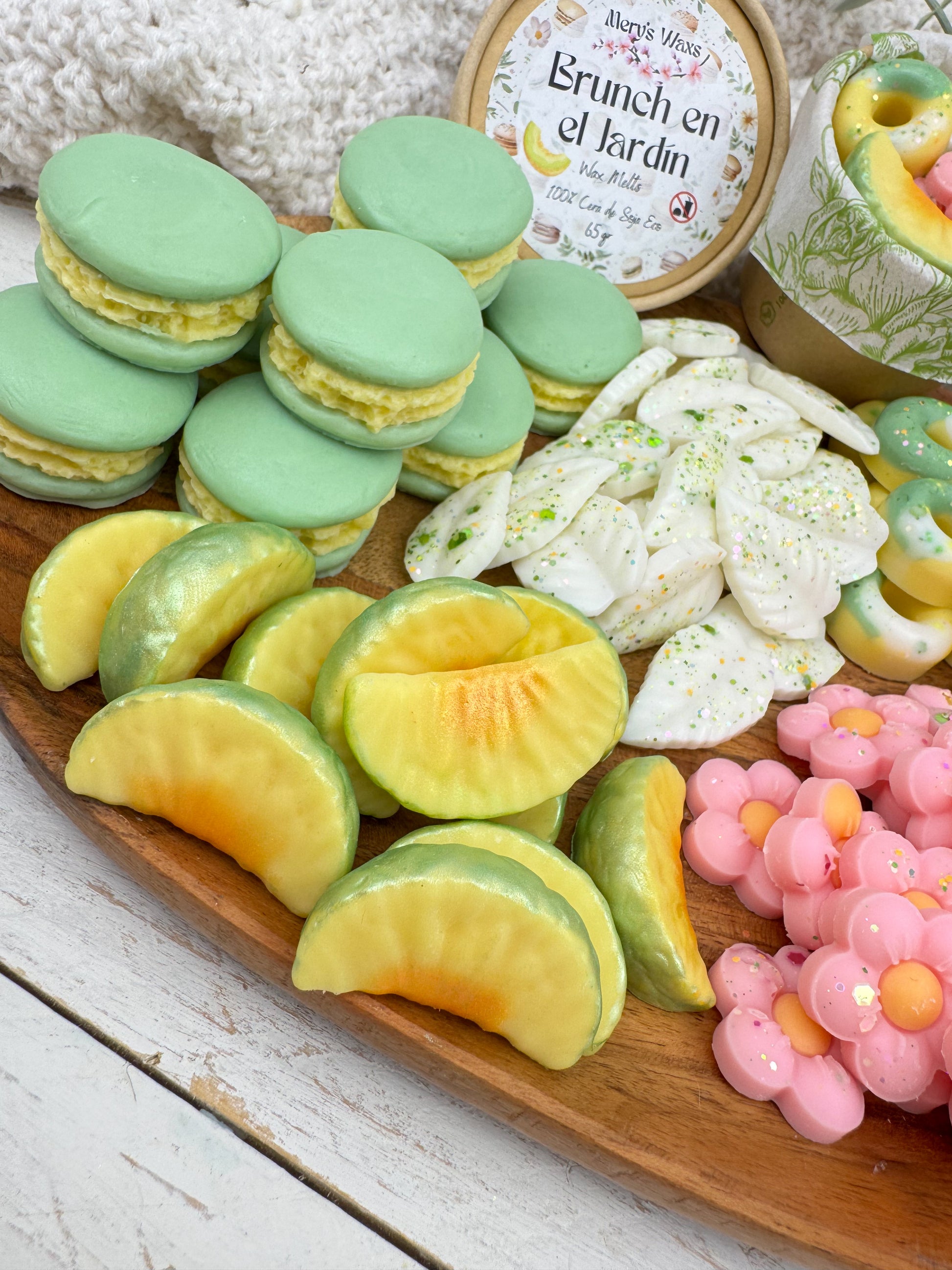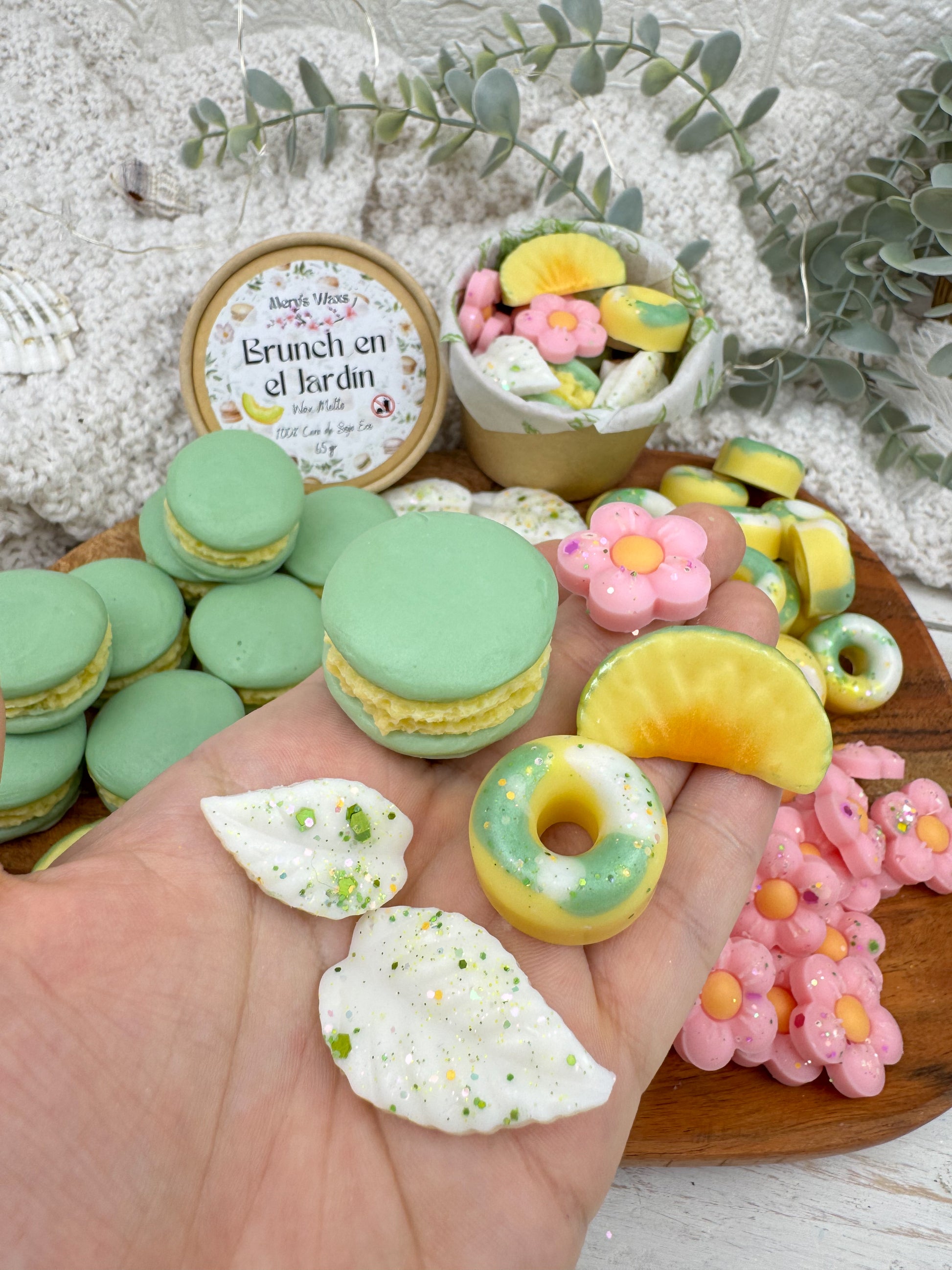 Brunch en el Jardín recoge esa sensación en forma de wax melts: macarons, donuts, flores, hojitas y rodajas de melón. Cada pieza evoca a un desayuno al aire libre.