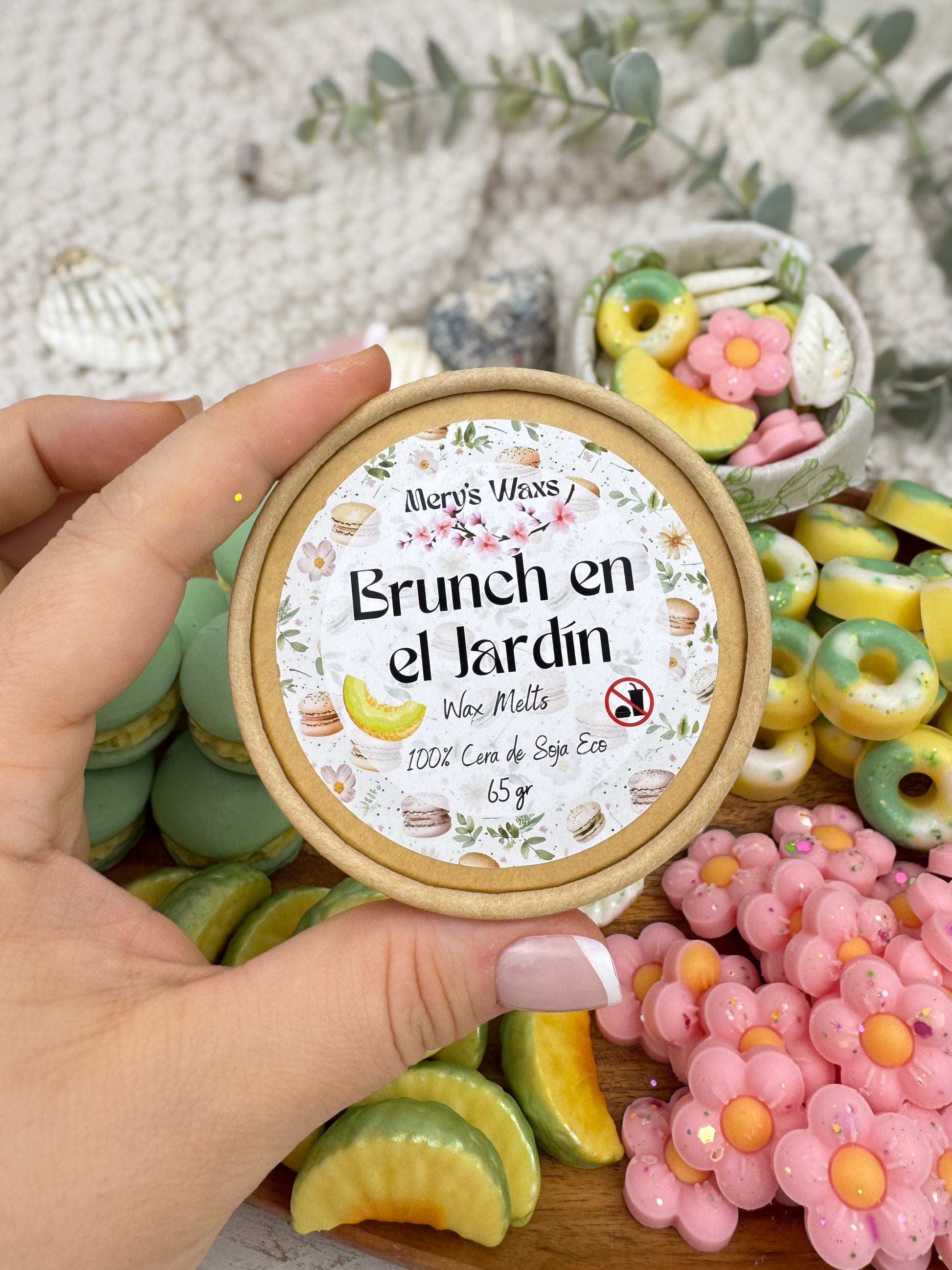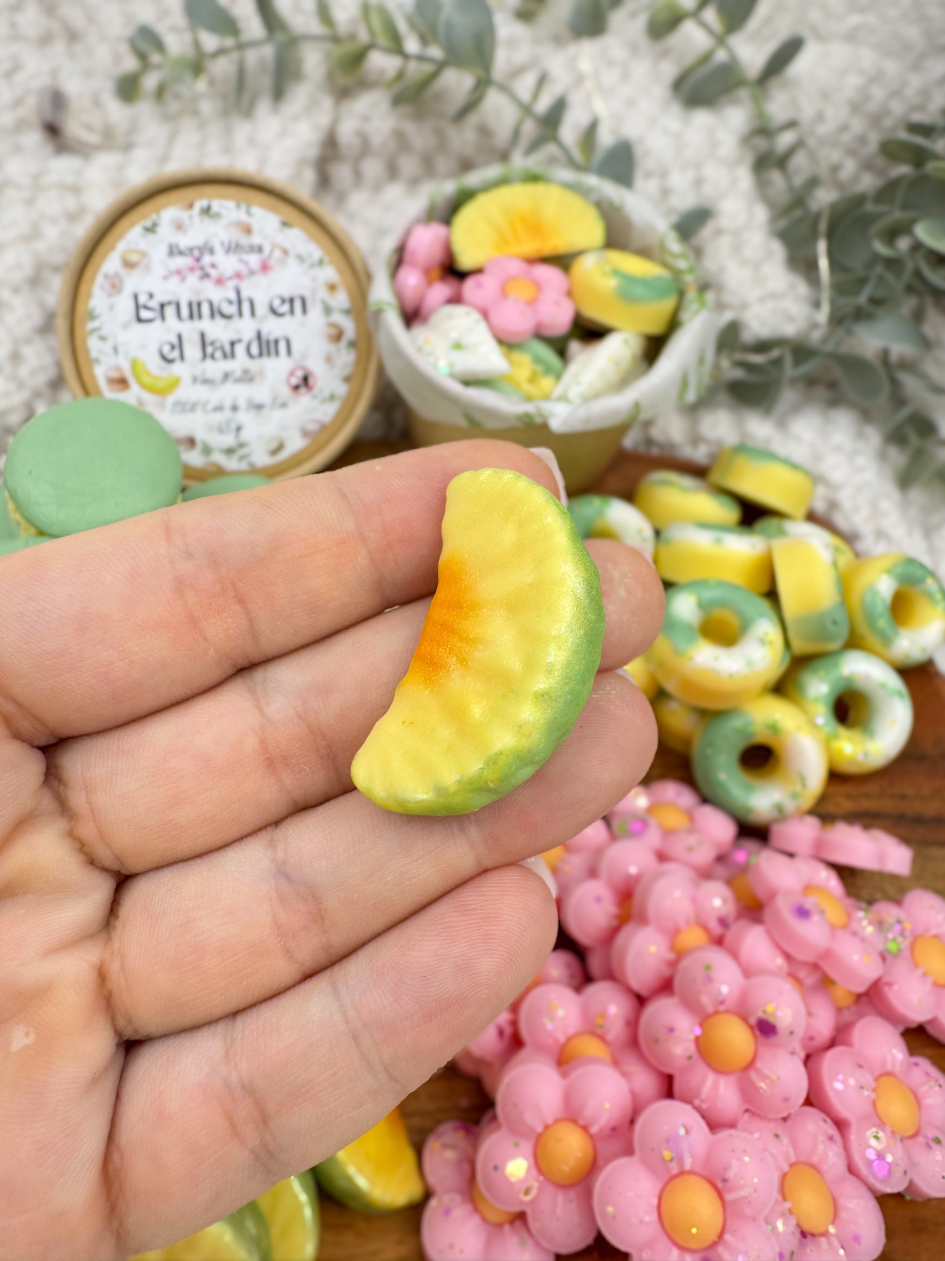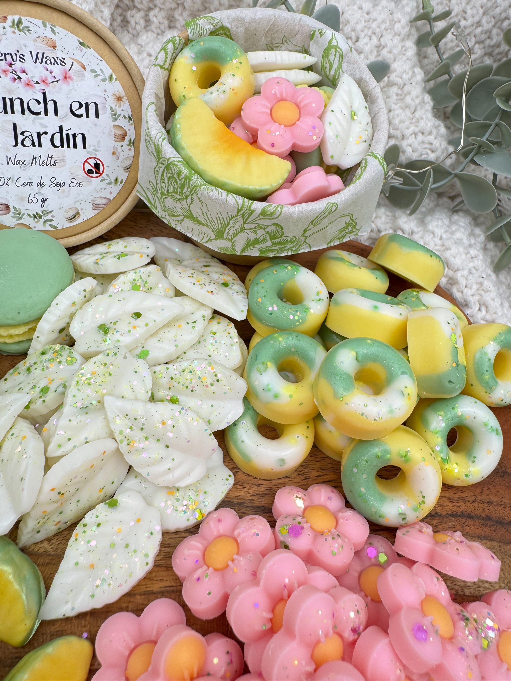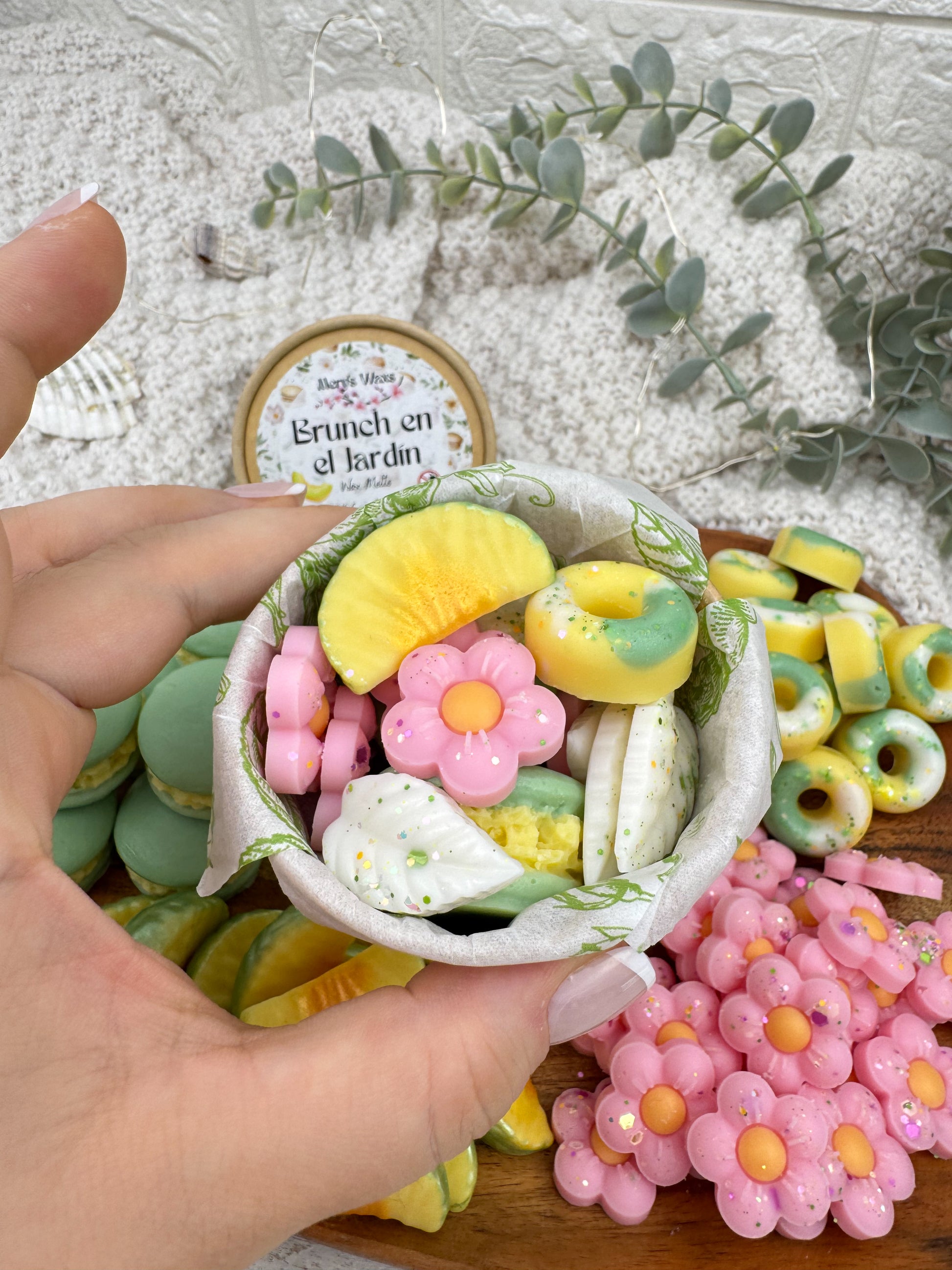 Brunch en el Jardín recoge esa sensación en forma de wax melts: macarons, donuts, flores, hojitas y rodajas de melón. Cada pieza evoca a un desayuno al aire libre.