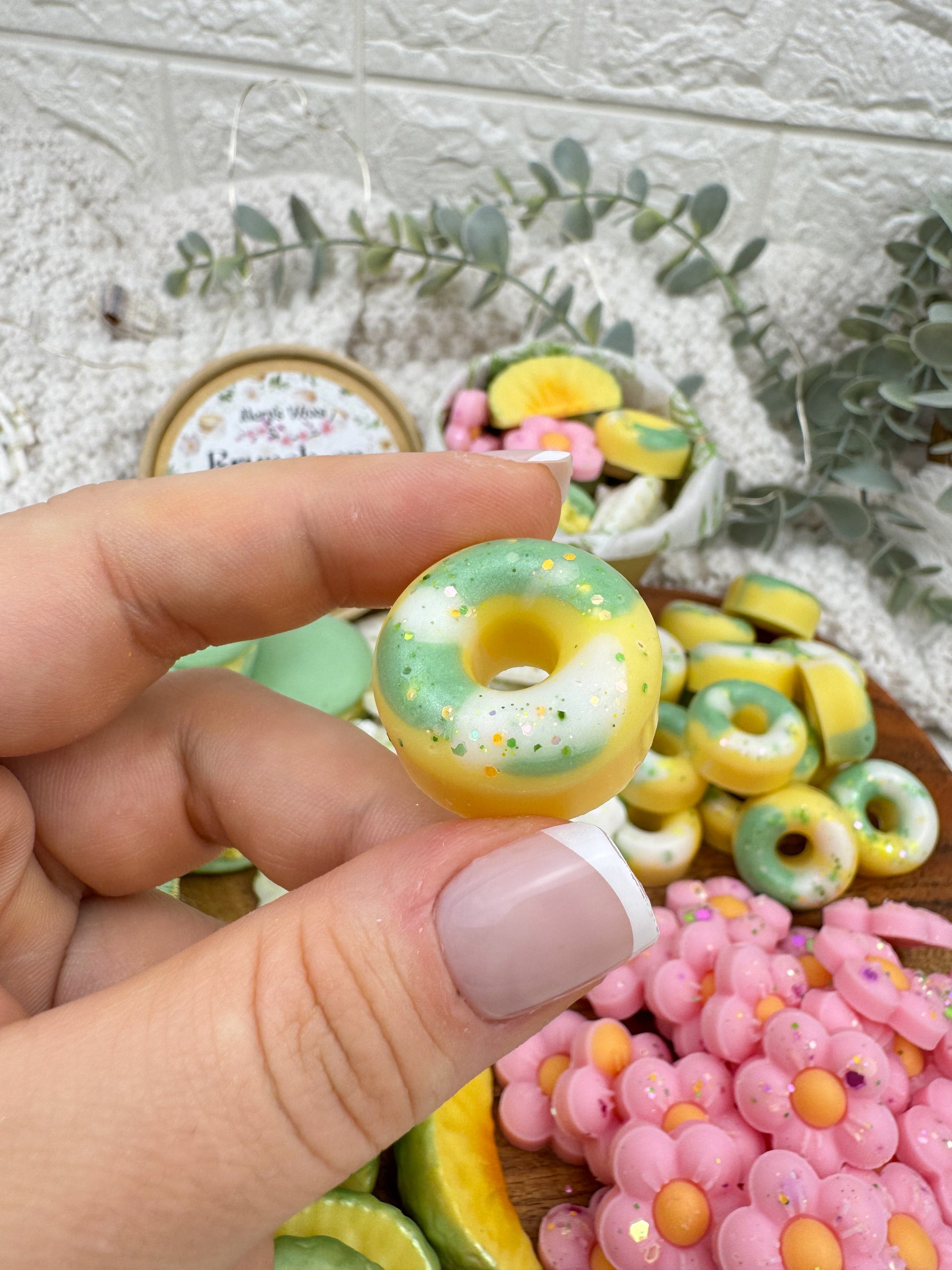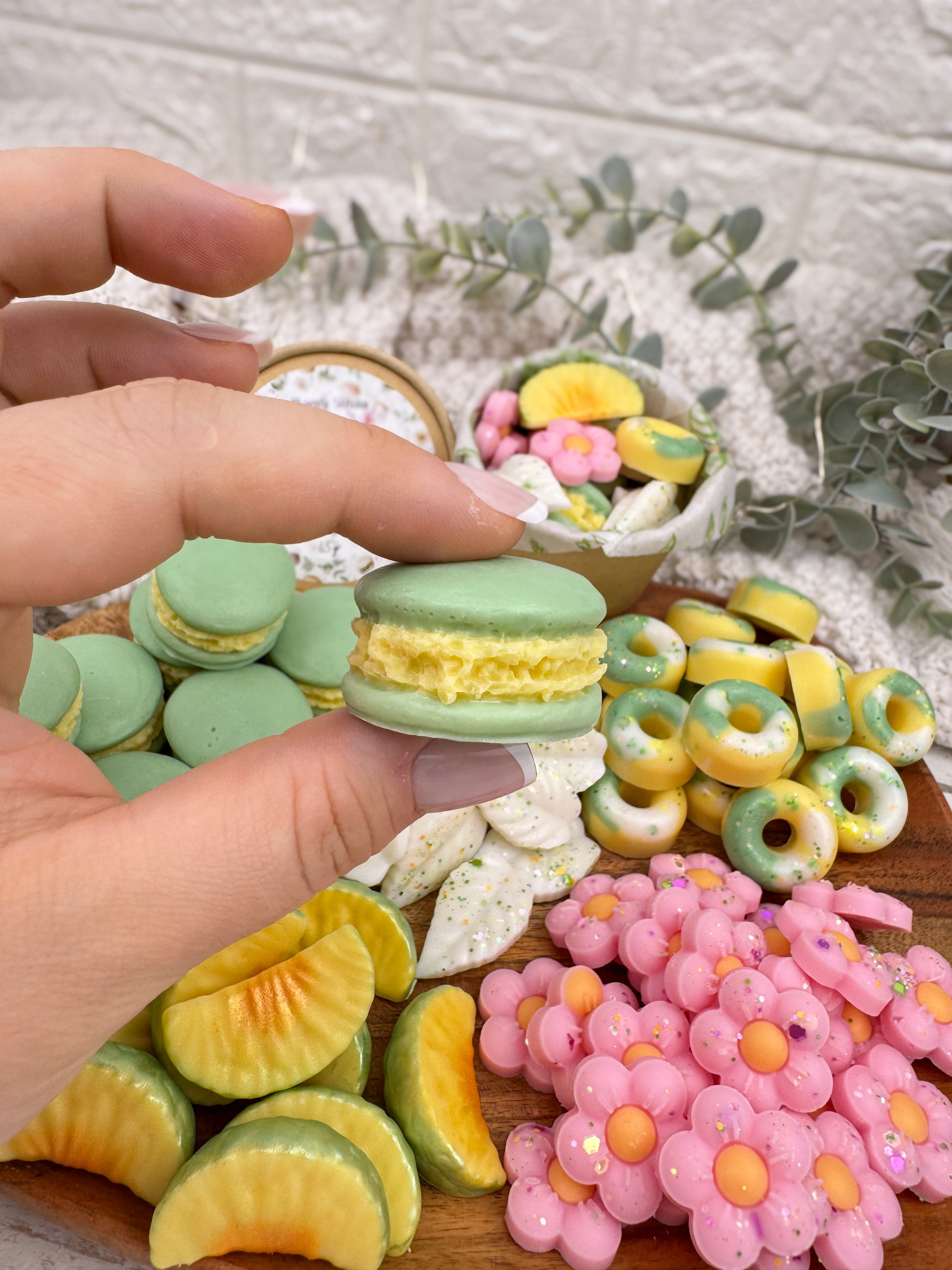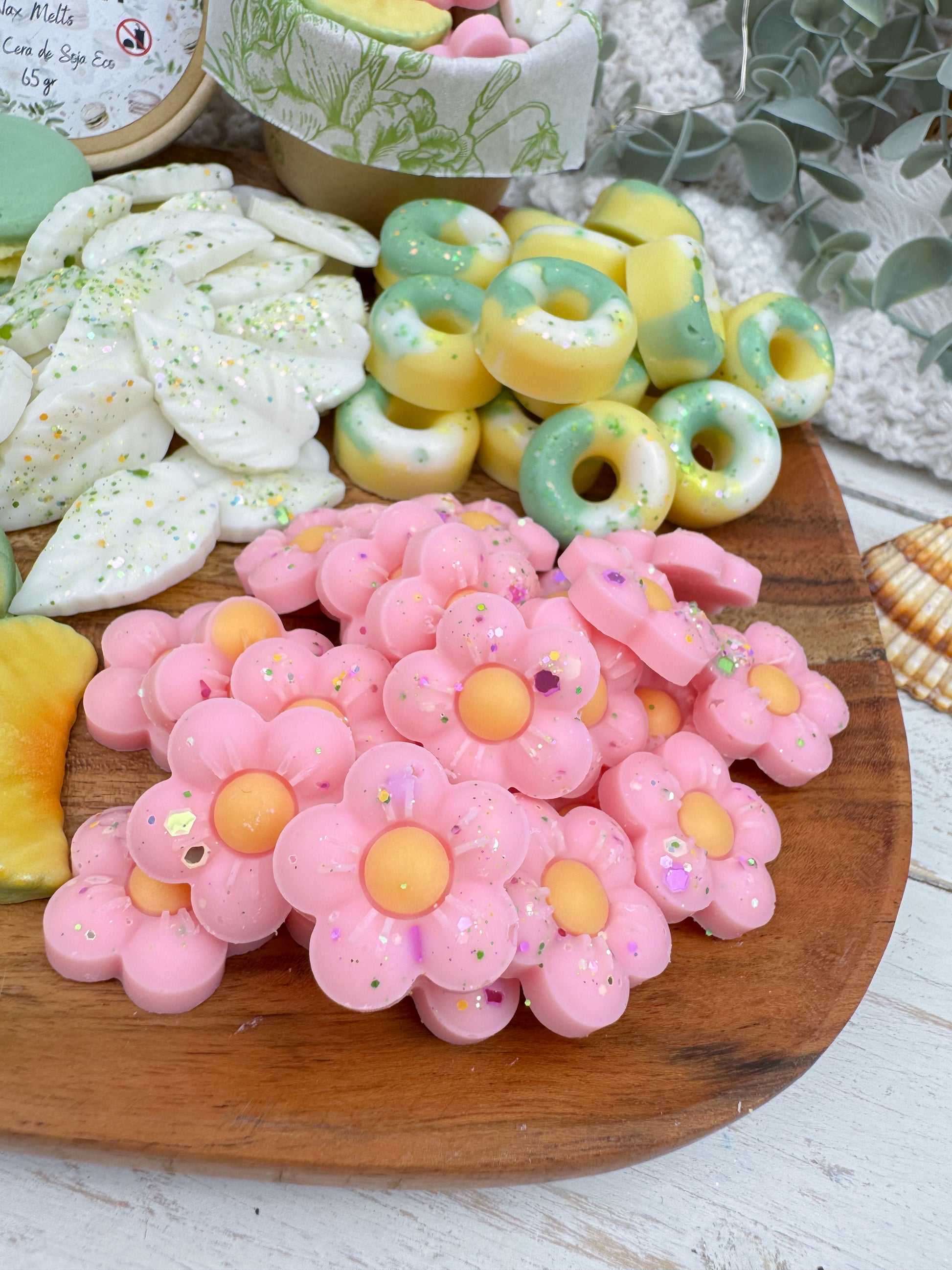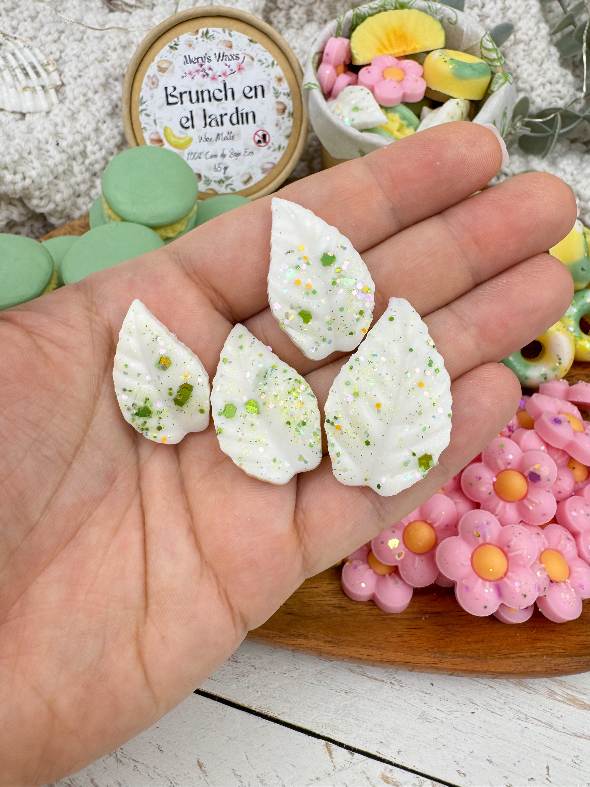 Brunch en el Jardín recoge esa sensación en forma de wax melts: macarons, donuts, flores, hojitas y rodajas de melón. Cada pieza evoca a un desayuno al aire libre.