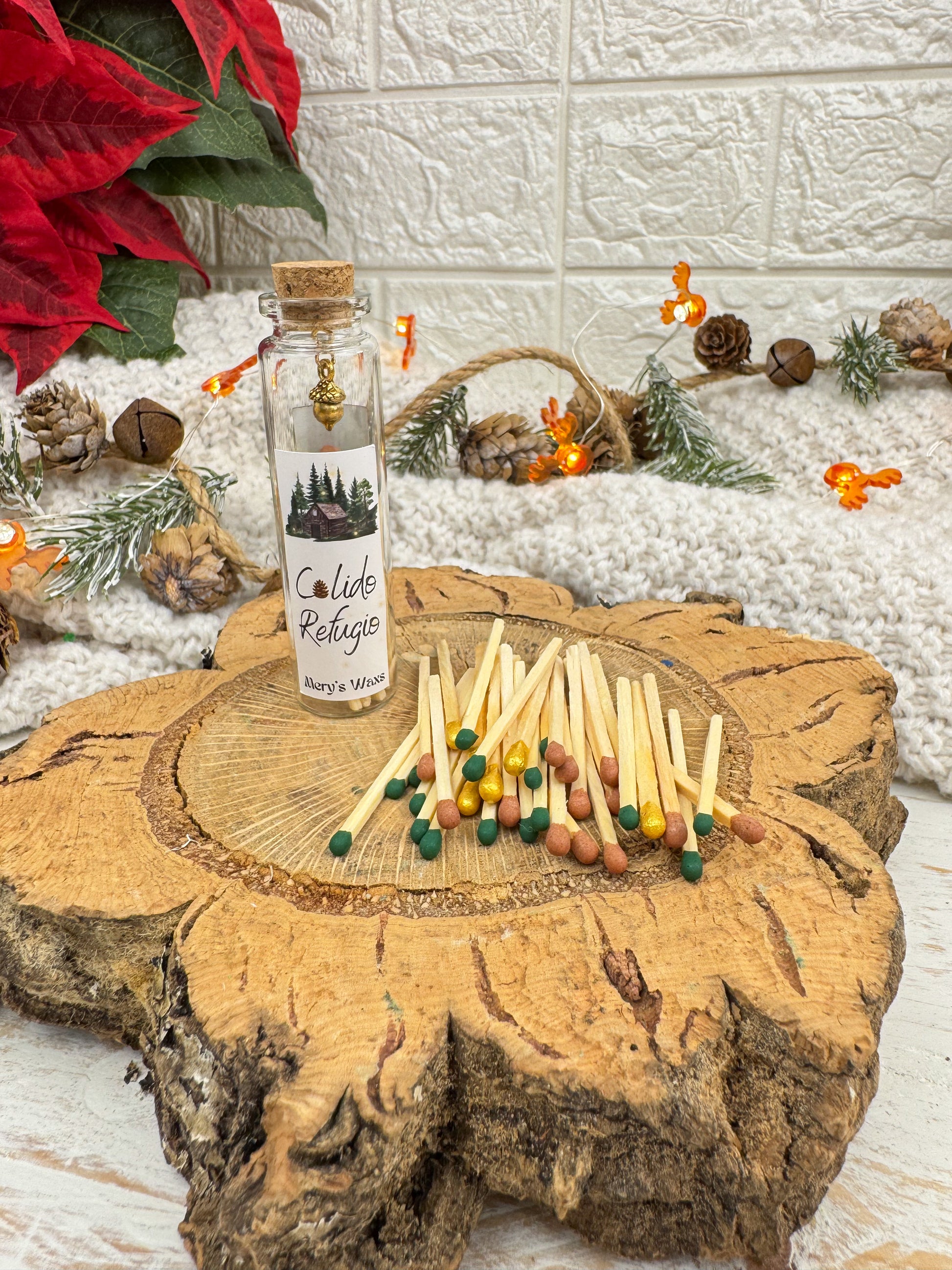 Un pequeño tesoro pensado para encender momentos especiales. Cálido Refugio es un bote de cristal con tapón de corcho que guarda en su interior 25 cerillas en tonos dorados, verdes y marrones, como un paseo por el bosque en pleno invierno. Cada cerilla es un destello cálido, suave y acogedor.