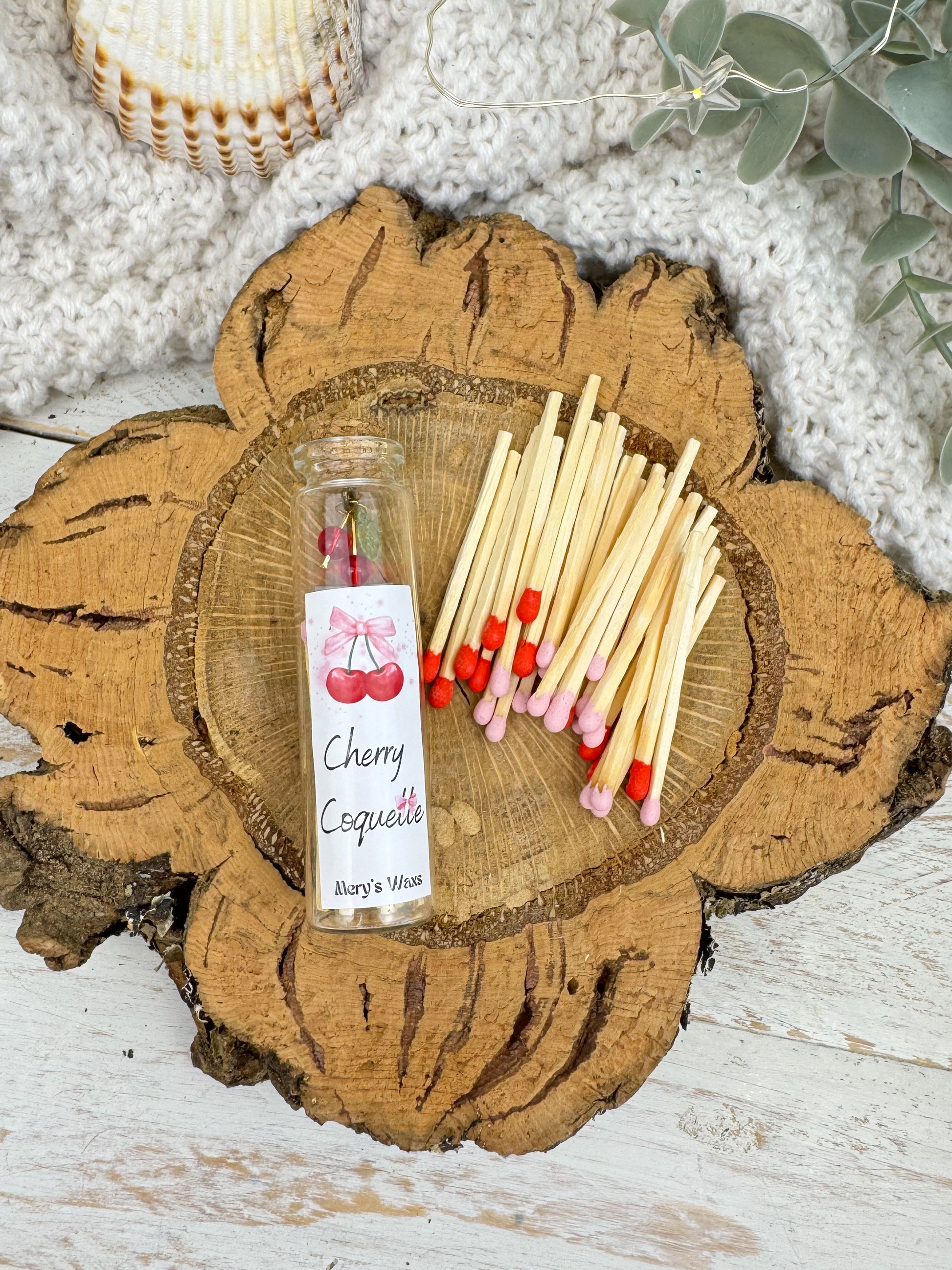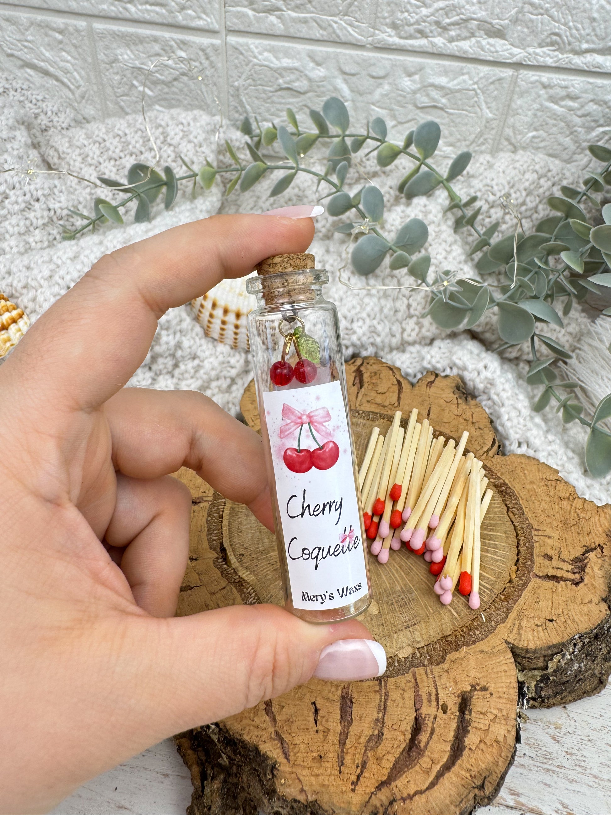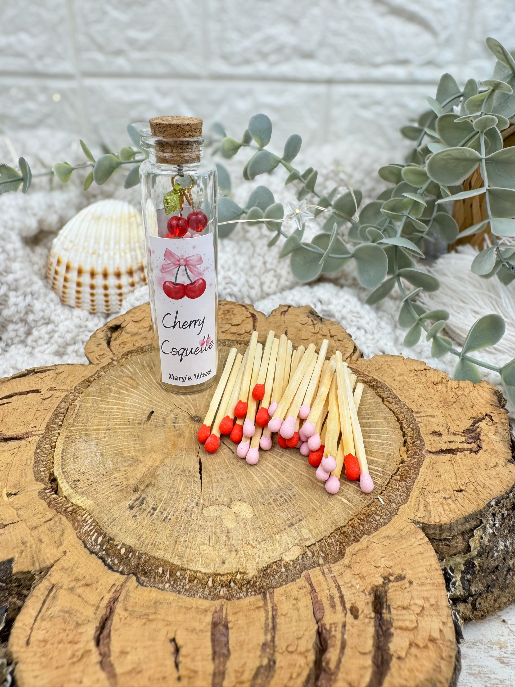 El frasco Cherry Coquette incluye 20 cerillas en tonos rosa y rojo, inspiradas en la dulzura y picardía de unas cerezas brillantes. Cada frasquito lleva un pequeño charm de cerezas, perfecto para dar un toque coqueto a tu rincón favorito 🎀🍒