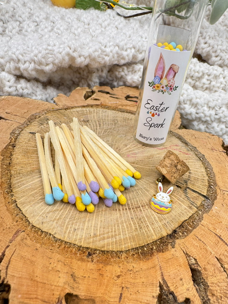 Pequeños destellos de Pascua 💫. Easter Spark reúne cerillas en tonos lila, celeste y amarillo dentro de un frasquito lleno de encanto. Como sorpresa, un charm de conejito escondido en un huevo añade un guiño mágico a esta edición especial. Ideal para iluminar momentos con calidez y dulzura primaveral.