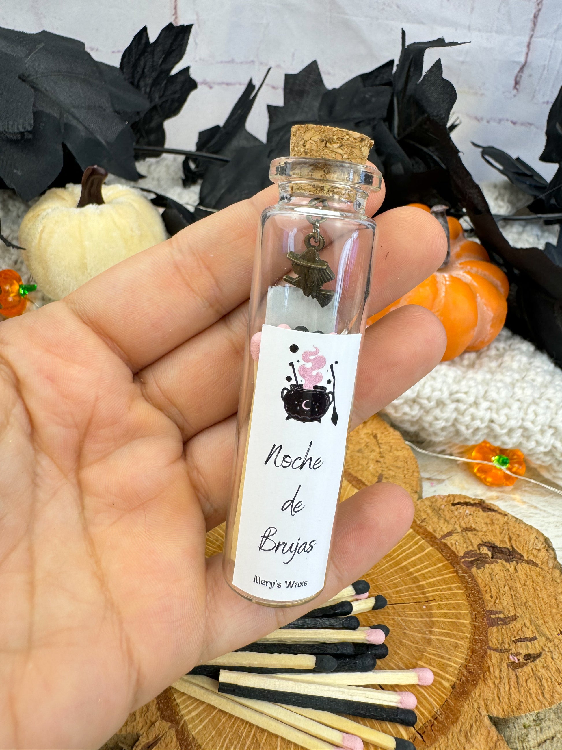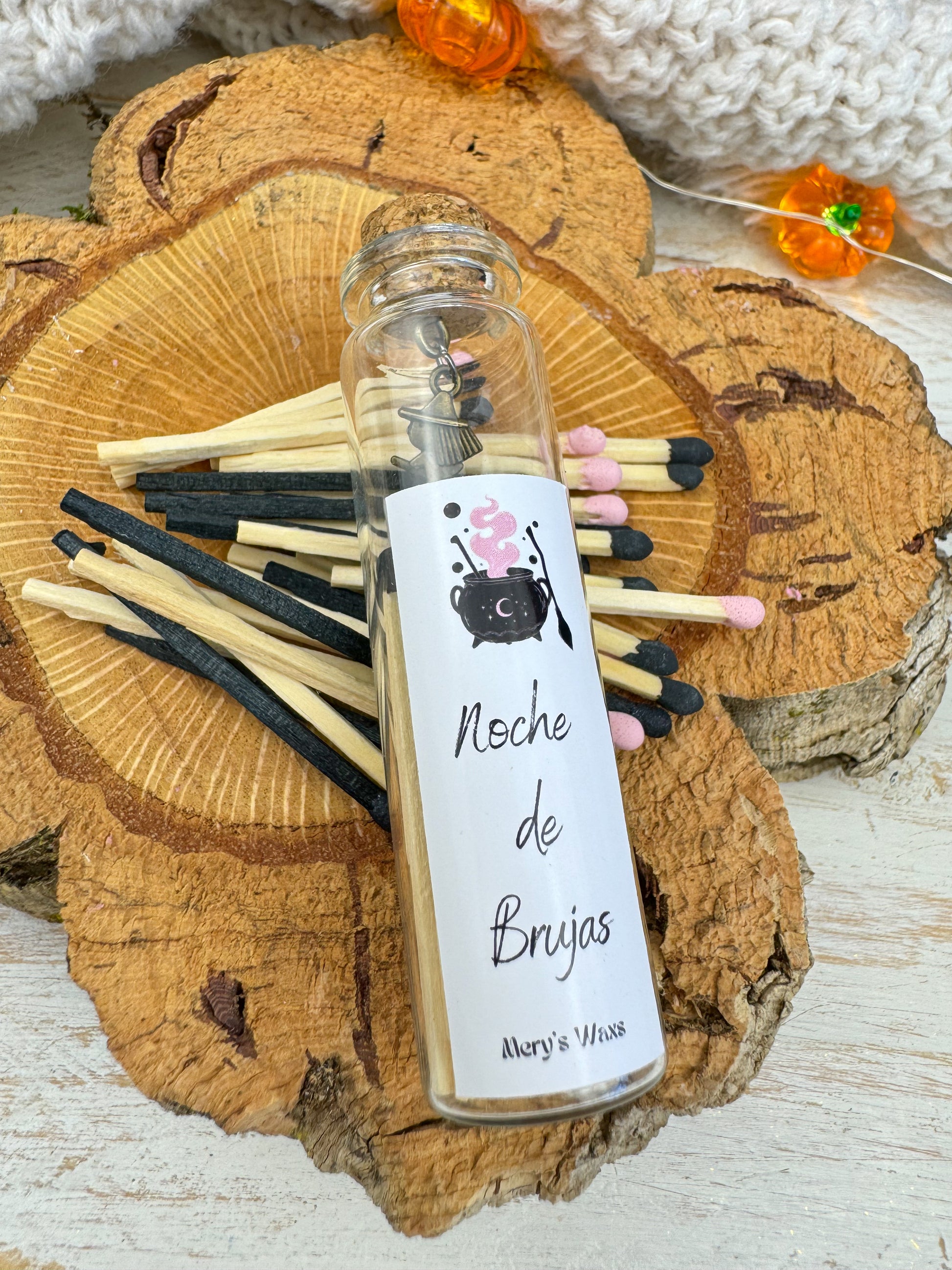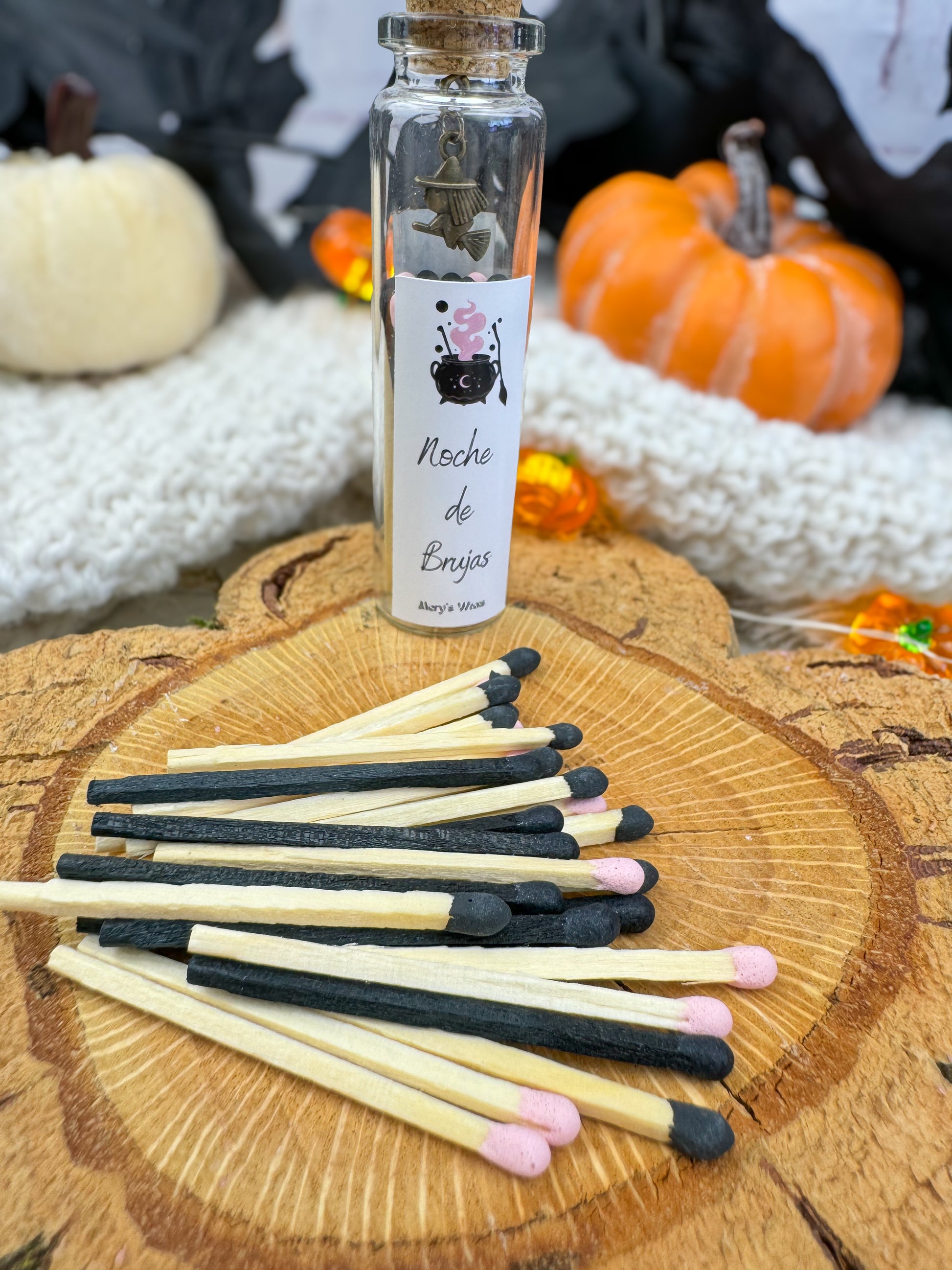 Noche de brujas son unas elegantes cerillas de Halloween presentadas en un mágico bote de cristal con tapa de corcho. Las cerillas, en tonos negros y rosas, evocan la esencia mágica de la noche más misteriosa del año. Perfectas para decorar o encender tu celebración.