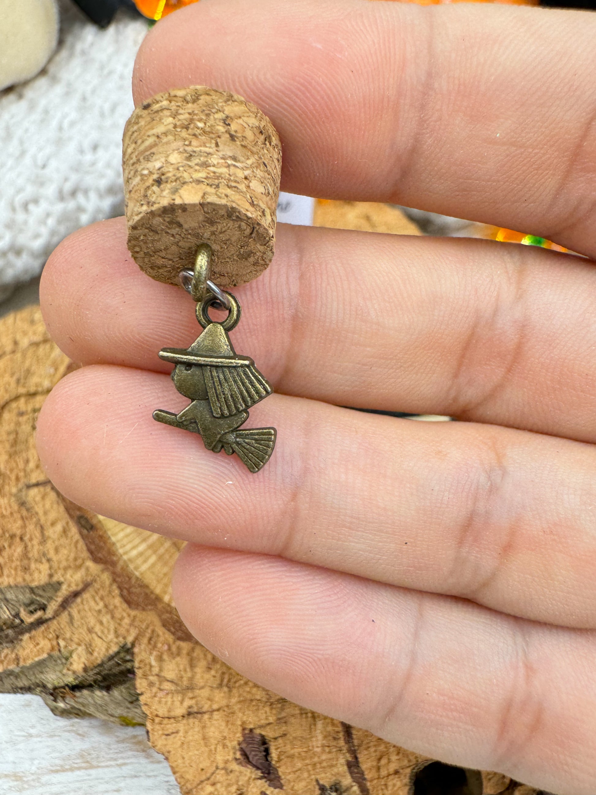 En el interior del bote lleva un charm de bruja volando en su escoba.