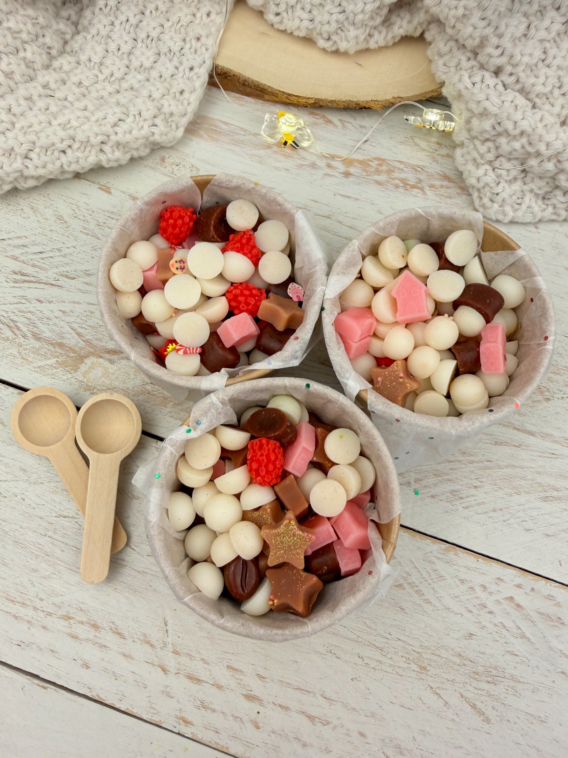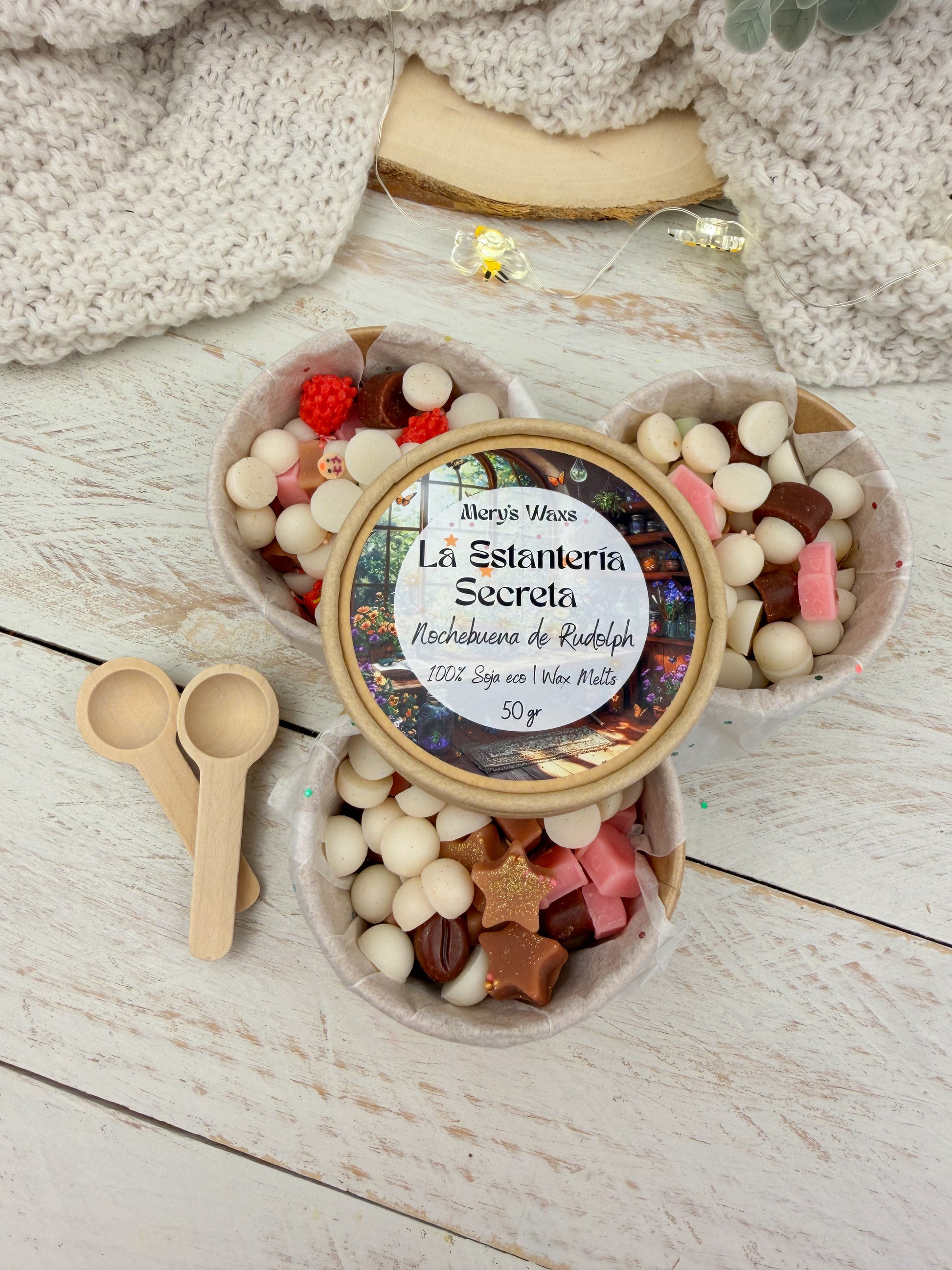 Formato: Wax melts con el relleno que tenia la bola de la Nochebuena de Rudoph. Se presenta en una vaso kraft pequeño de 50gr. Incluye una cucharita de madera para añadir los wax melts fácilmente en el quemador.