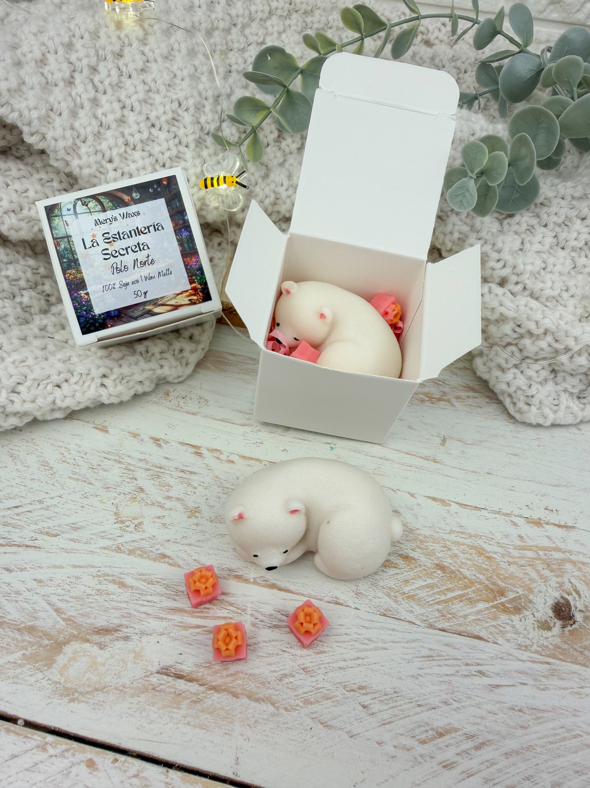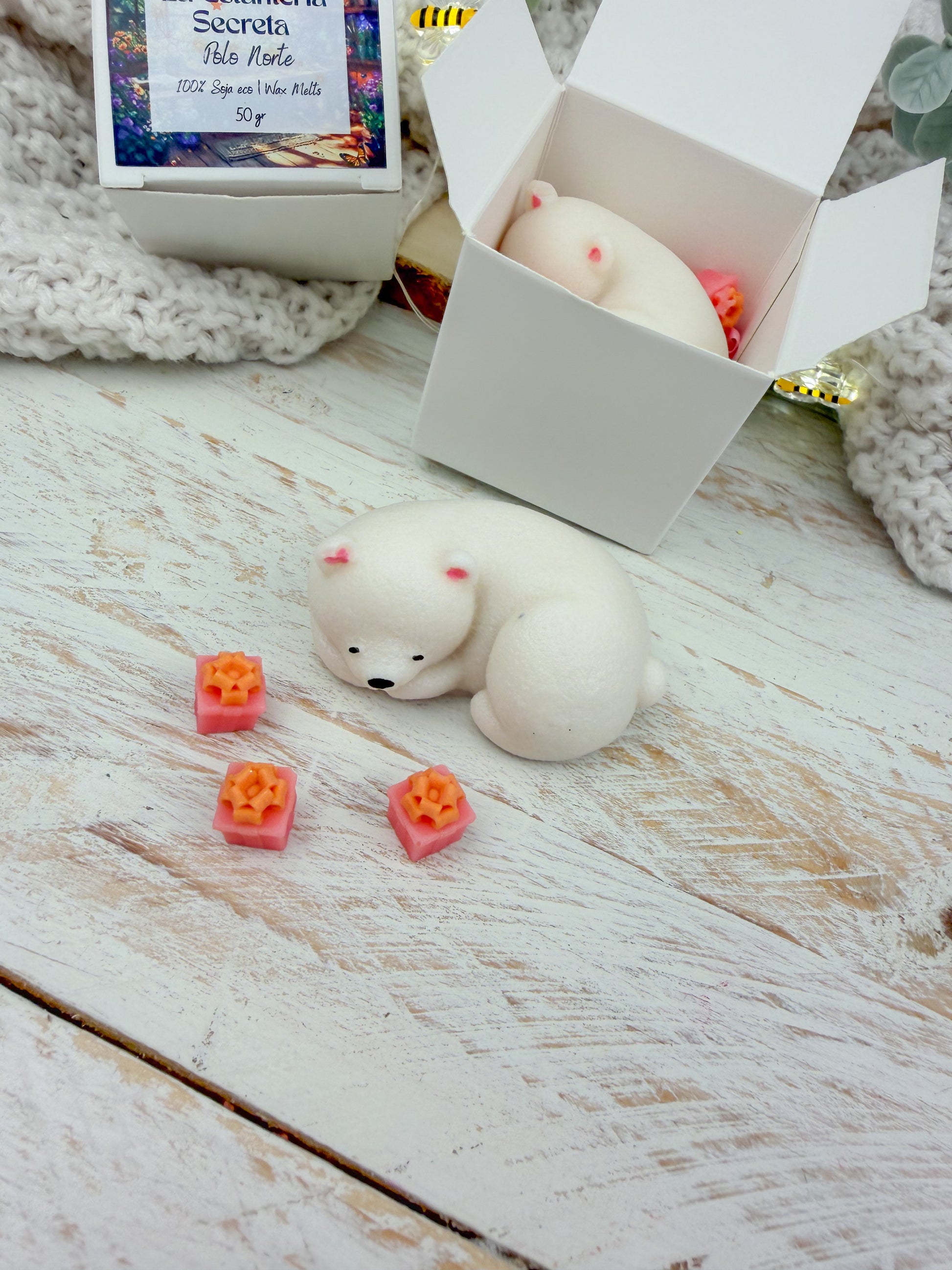 Formato: Wax melts con forma de osito polar, pintado a mano. La caja contiene 1 osito polar y 3 regalos de navidad. El osito polar recomendamos cortarlo en 2-3 veces. Para cortarlo te puedes ayudar con nuestro cortador de wax melts. Te dejamos a continuación el enlace directo: cortador para wax melts