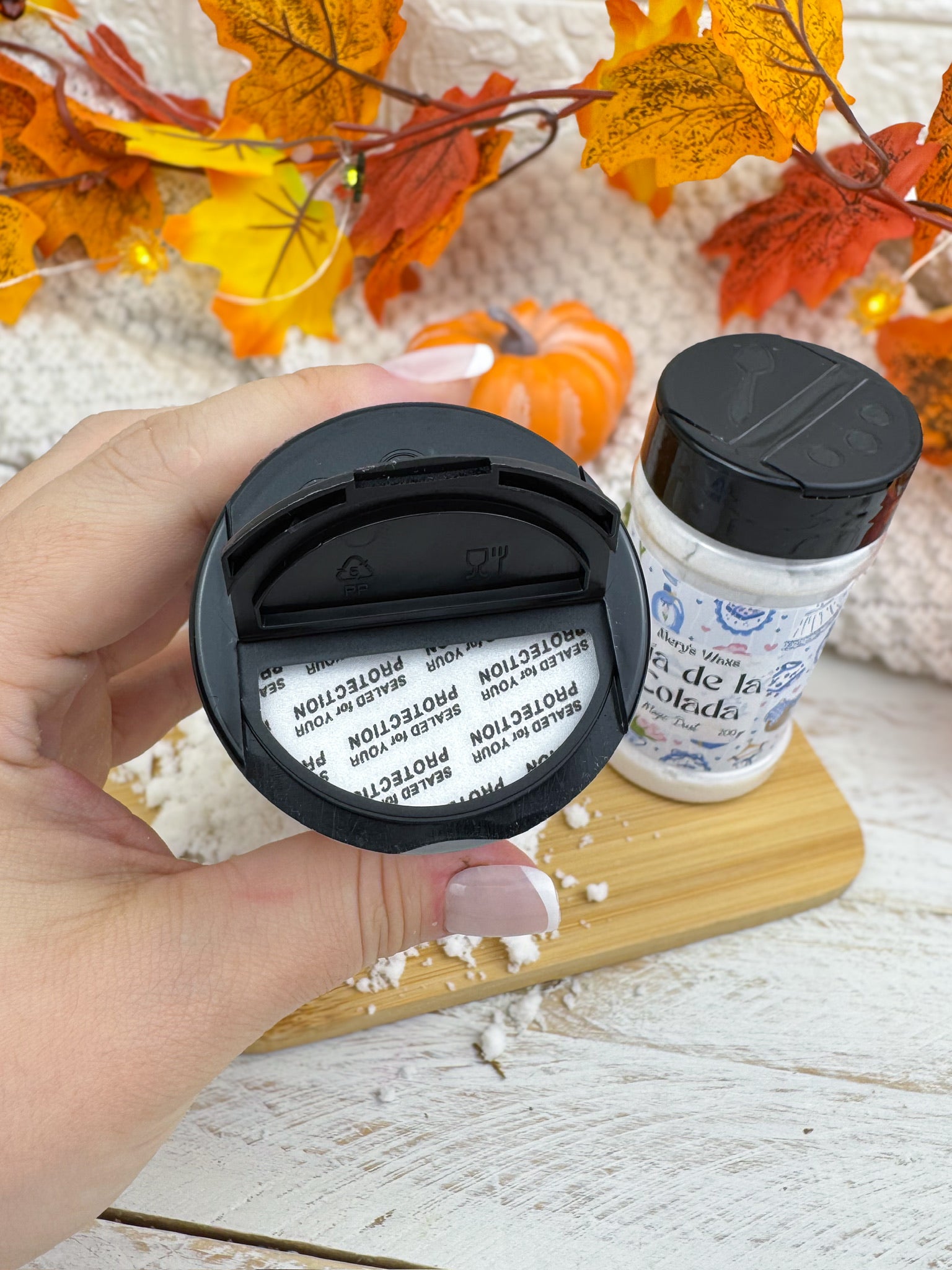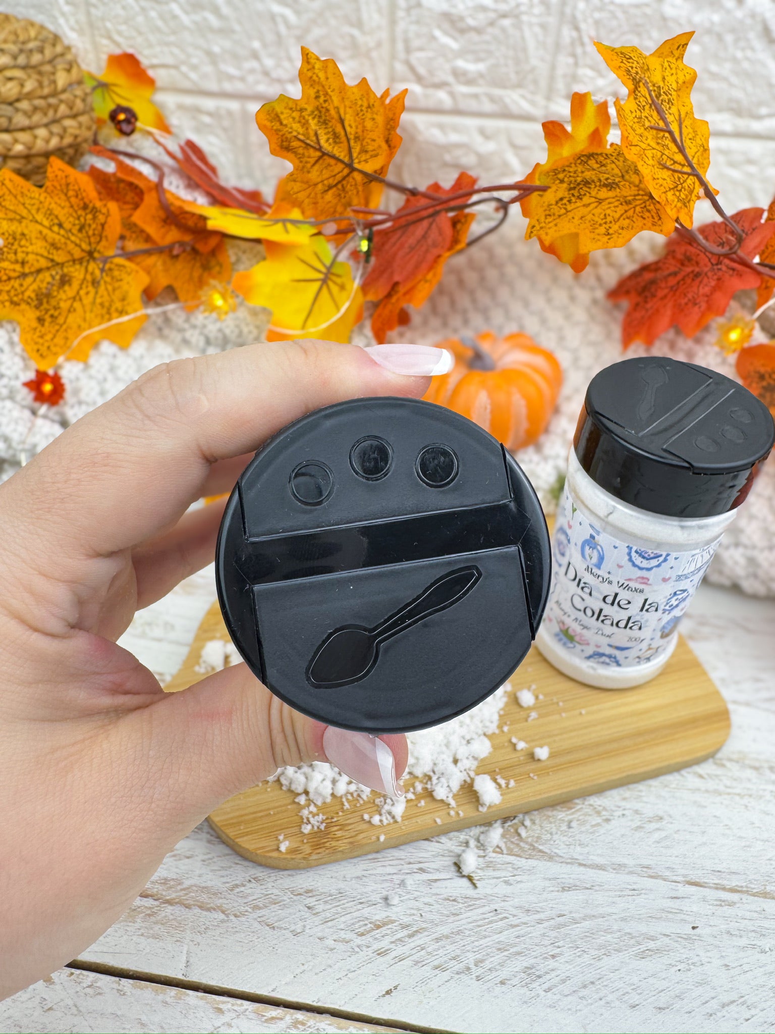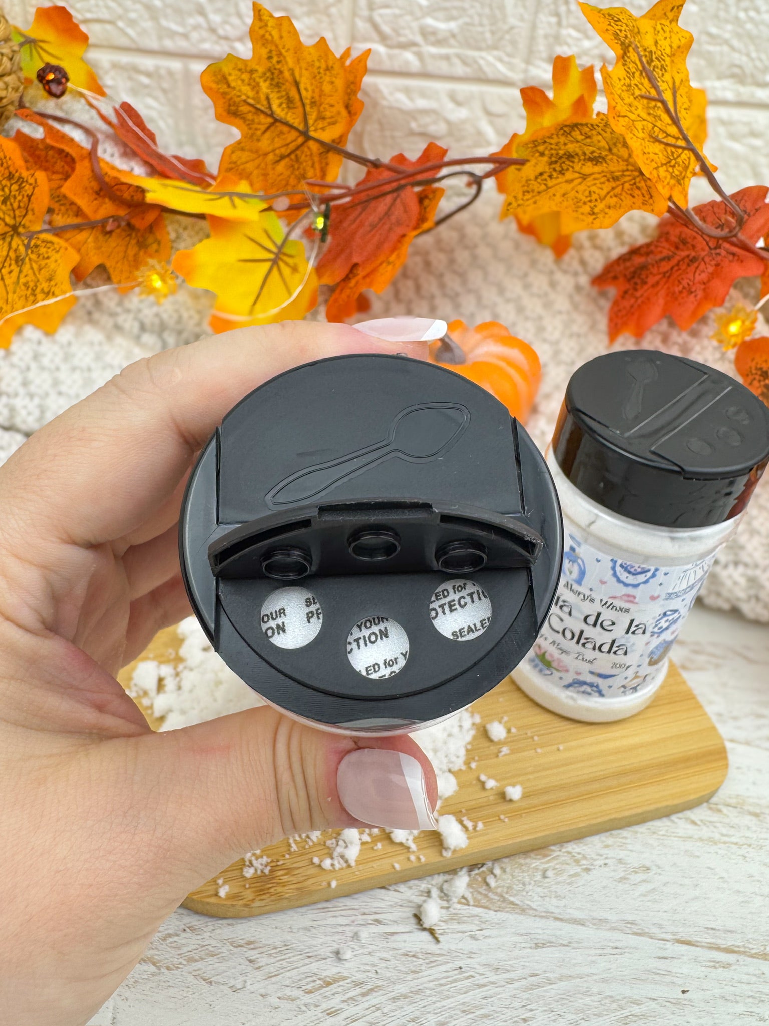 Bote dispensador de 200 ml, práctico y fácil de usar. Con este dispensador puedes espolvorear los polvos con la parte de los orificios o usar la parte mas grande para introducir una cuchara.