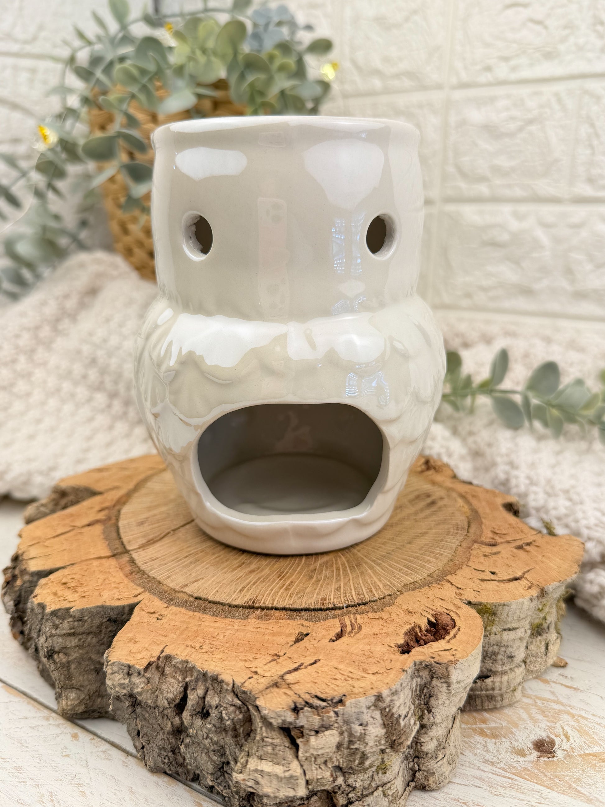 “Lechuza Mensajera” es un quemador de cerámica en tono blanco con delicados reflejos iridiscentes que capturan la luz de forma suave y cambiante. Su acabado nacarado aporta un brillo sutil que lo hace especialmente único y elegante.