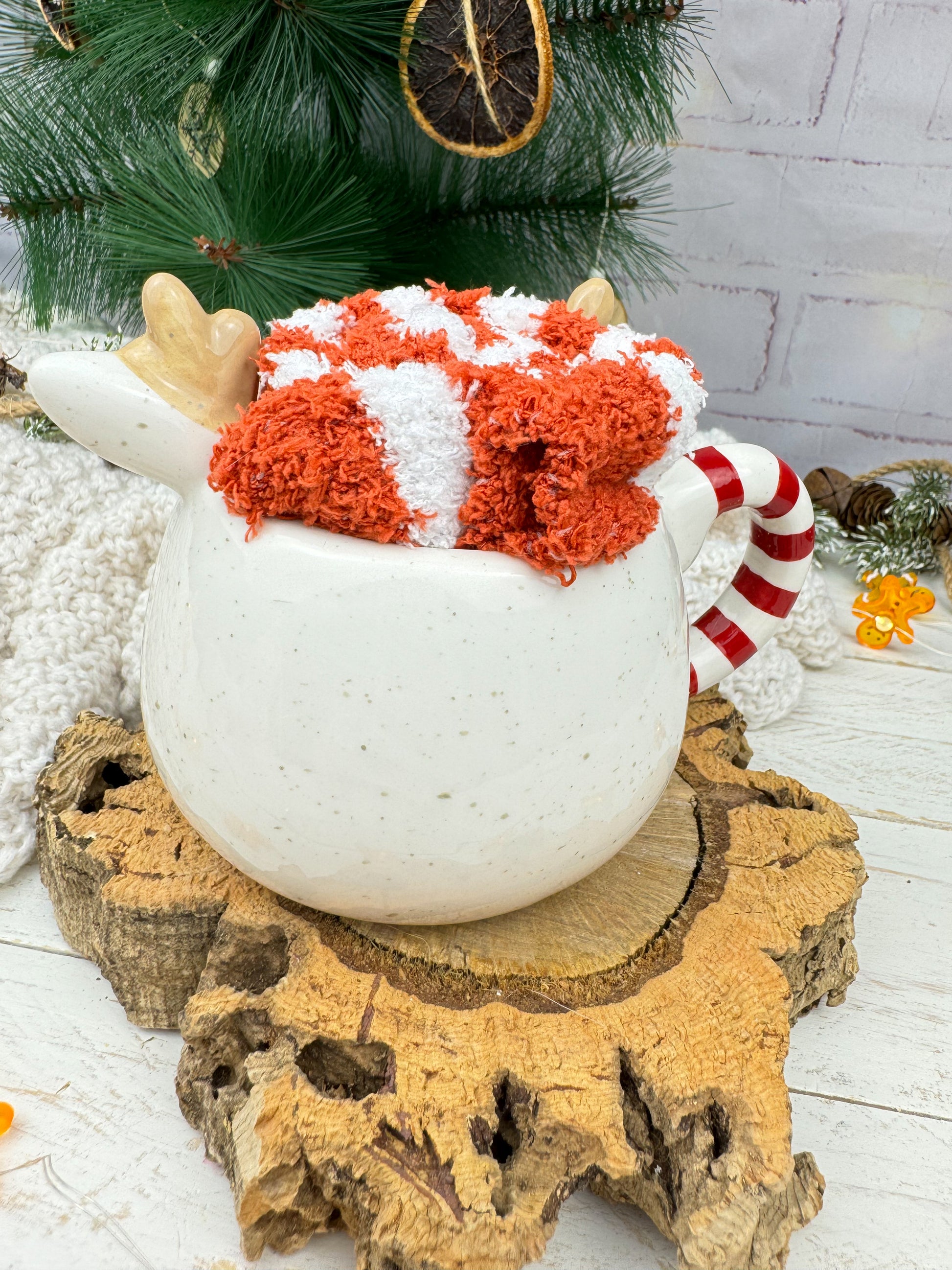 Dentro de la taza, se esconden unos suaves y acogedores calcetines navideños en tonos rojos y blancos, ideales para combinar con tu bebida favorita mientras te relajas en estas fechas. Esta taza no solo es funcional, sino que también es una pieza encantadora que traerá sonrisas a tu hogar. ¡Es el detalle perfecto para acompañar tus momentos más especiales!