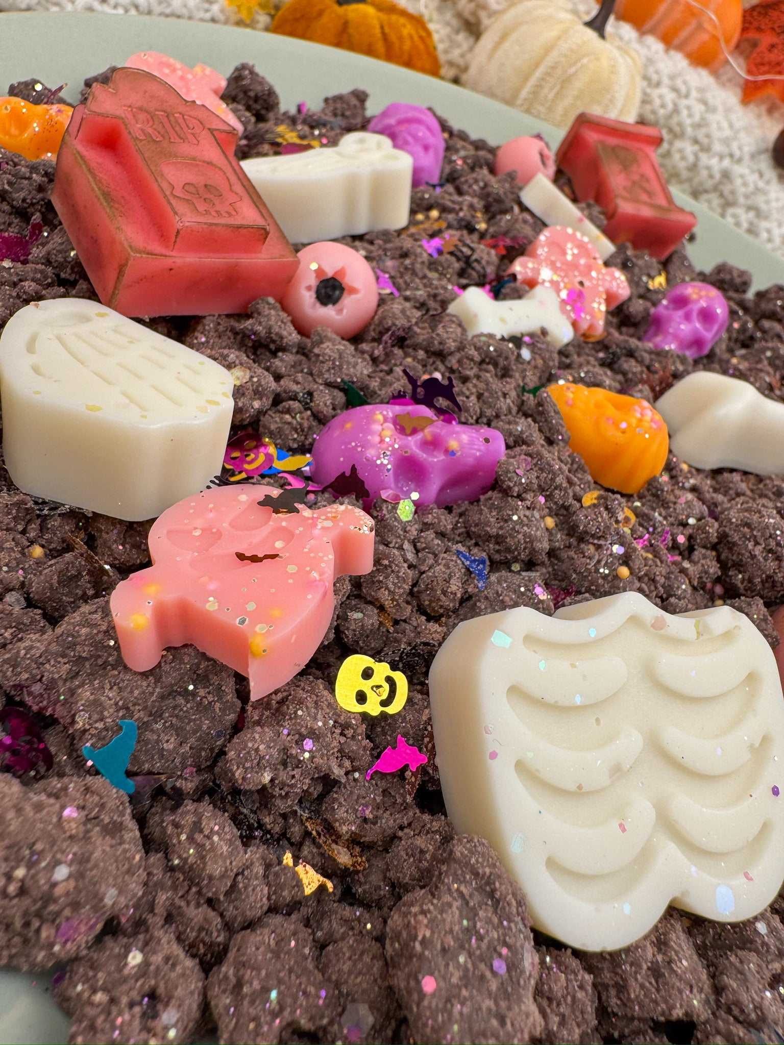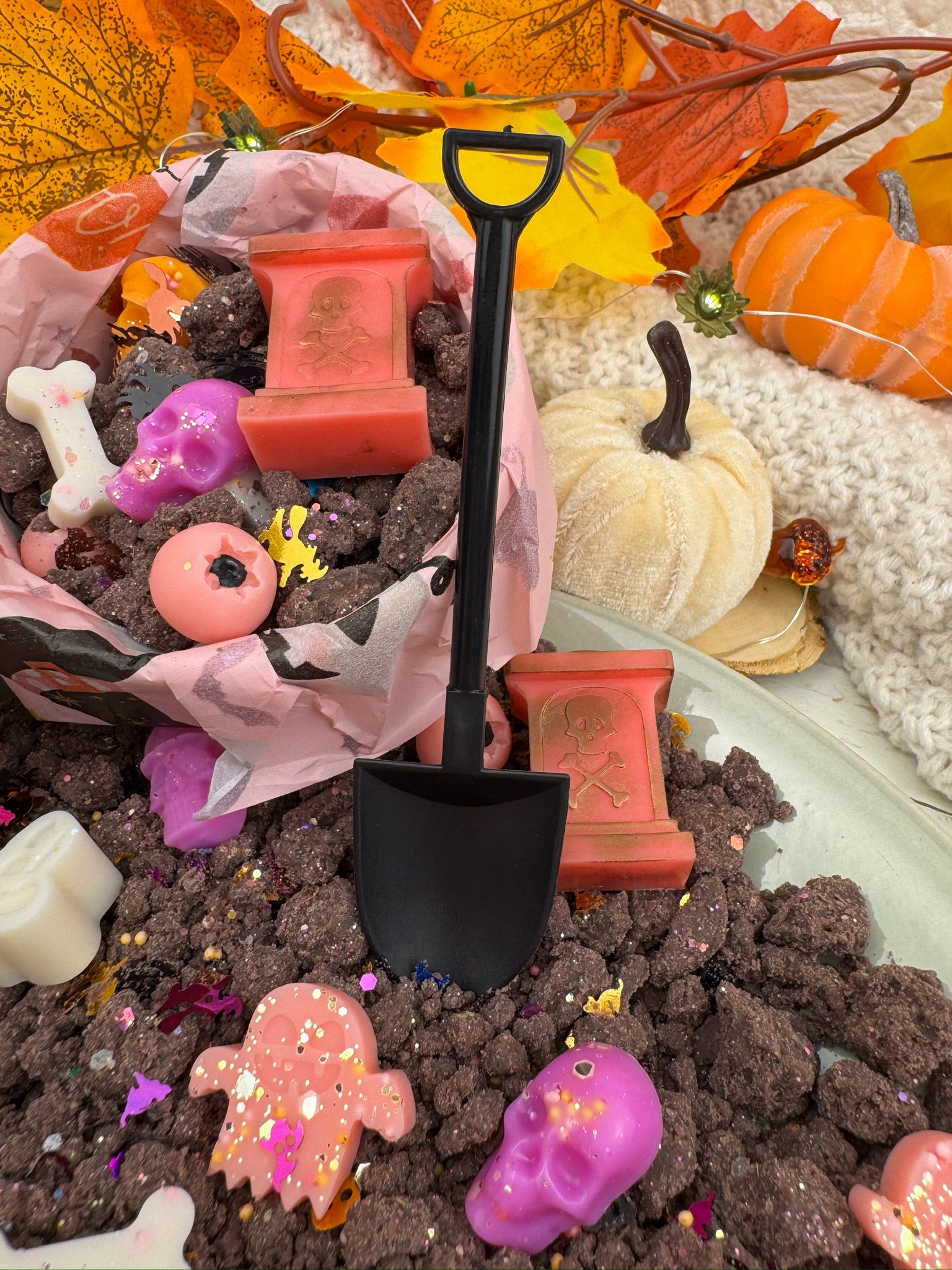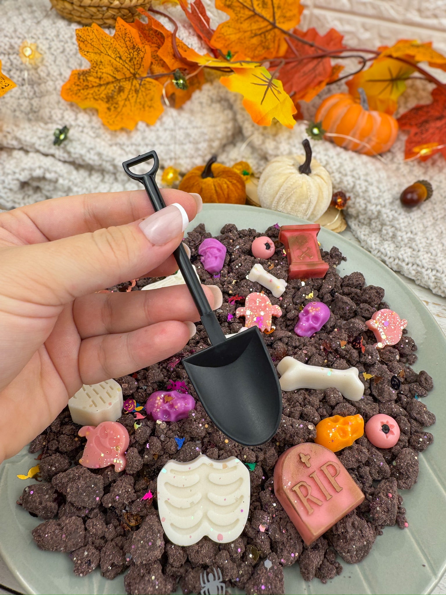 Incluye una mini pala 🪣 para que excaves en la “tumba” y sirvas tu crumble en el quemador 🔥.