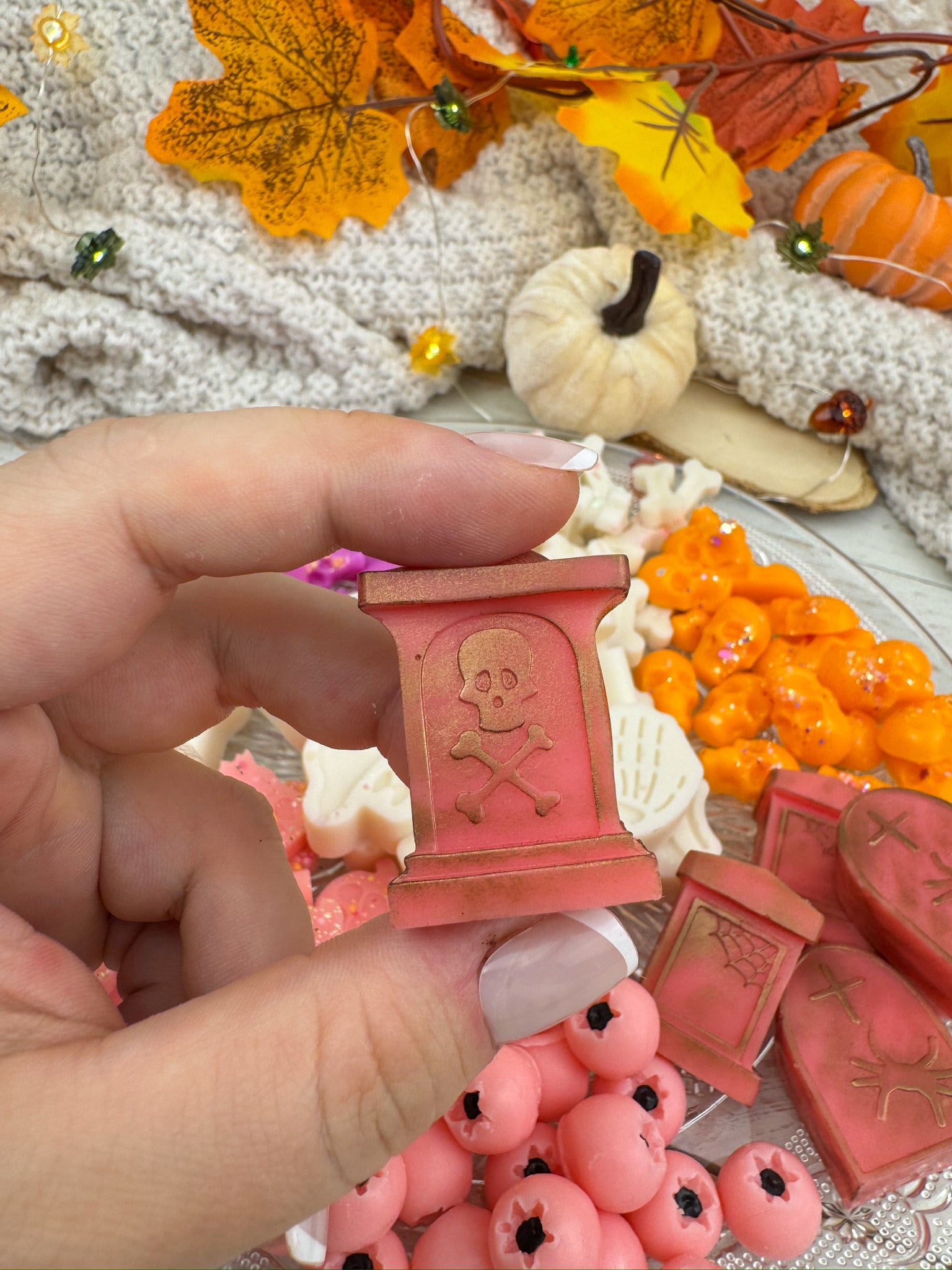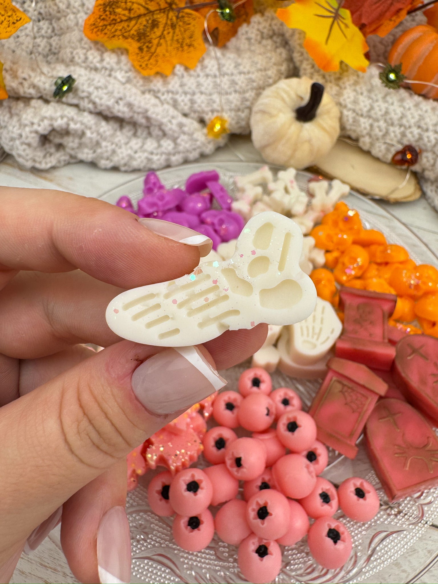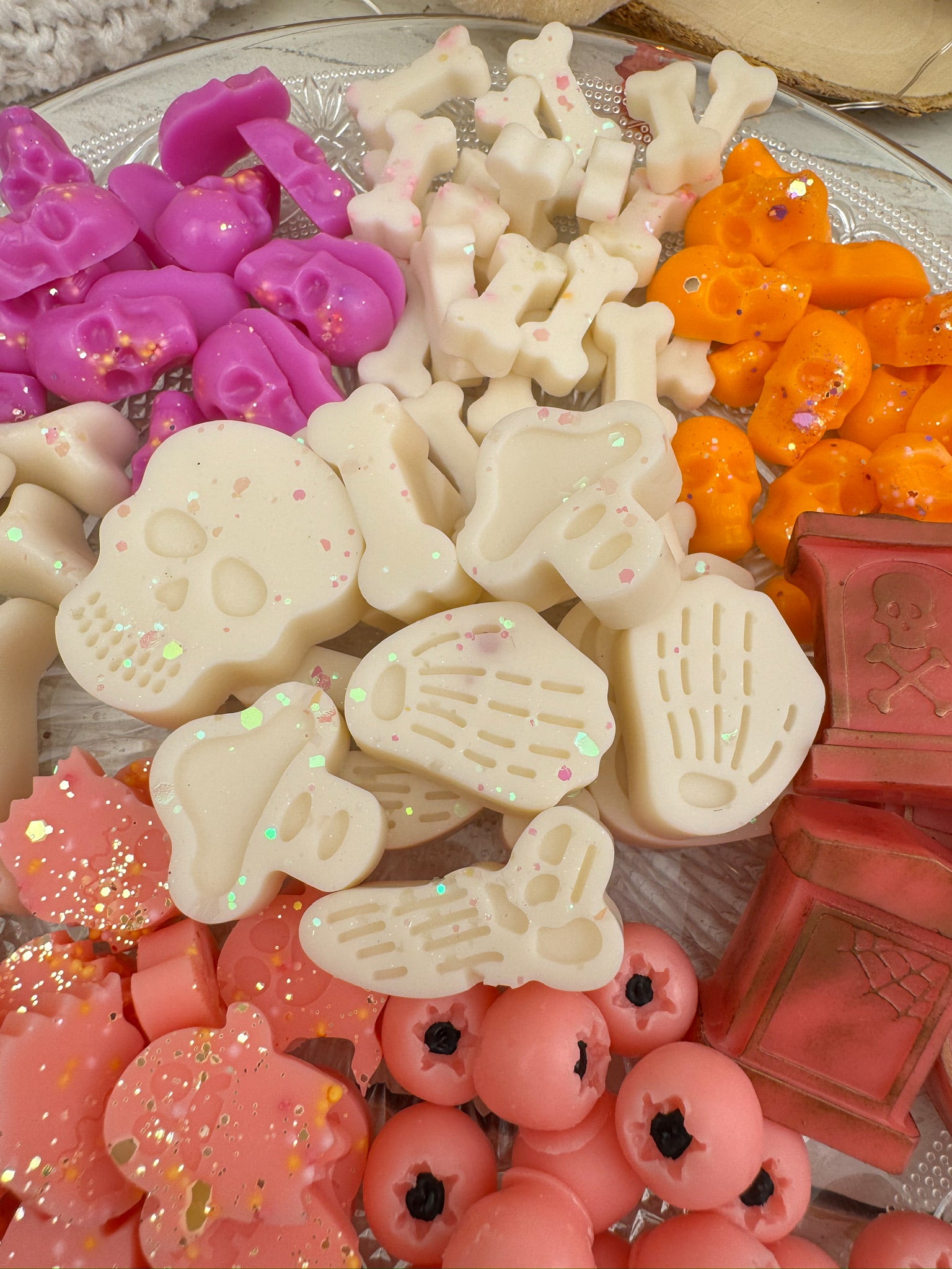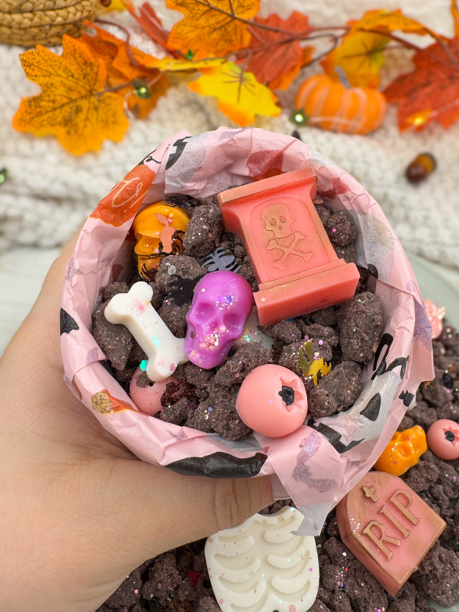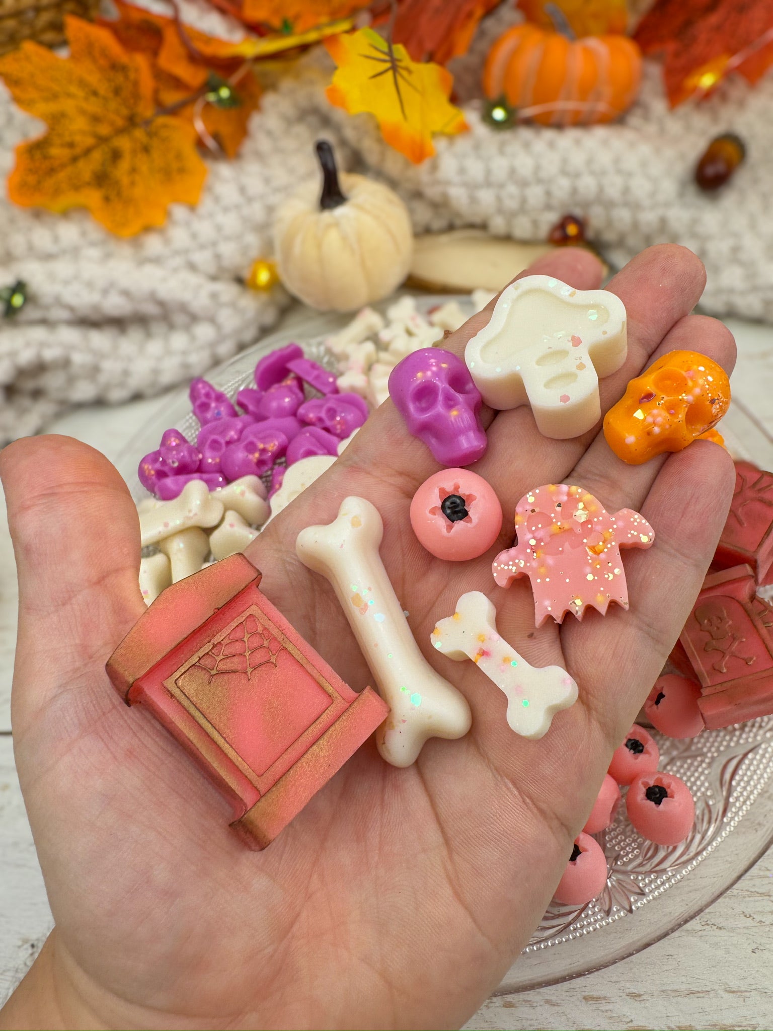 Cada pack de 90-100 gr esconde un verdadero festín tétrico: figuras en forma de huesos, ojos, calaveras, fantasmas y lápidas, decoradas con un toque brillante ✨ y festivo.